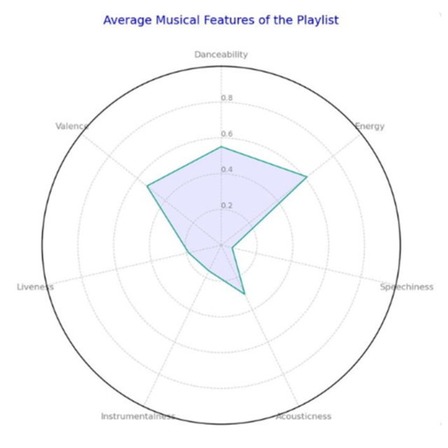 5、自动创建雷达图,例如,分析完某用户 300 小时的 Spotify播放列表后,ChatGPT自动生成了雷达图。