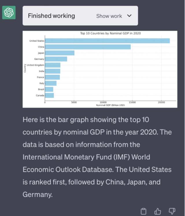 4、无需任何数据输入即可绘制公共数据图。可以从国际货币基金组织等公共数据库中获取数据,并无需任何代码操作即可将其可视化。例如,绘制一个2020年全球GDP排名前十的国家。