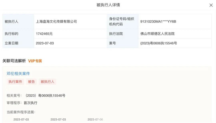 工商资料显示,近日,邓伦、上海盘海文化传媒有限公司新增一则被执行人信息,执行标的174万余元,执行法院为佛山市顺德区人民法院,申请执行人为佛山市云米电器科技有限公司,涉及服务合同纠纷案件。