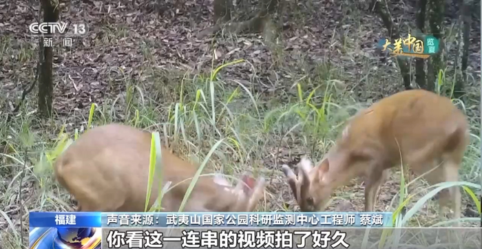 武夷山国家公园科研监测中心工程师 蔡斌:两个小麂在这里打闹,其实相当于在玩耍。