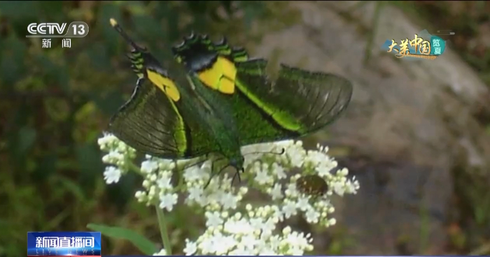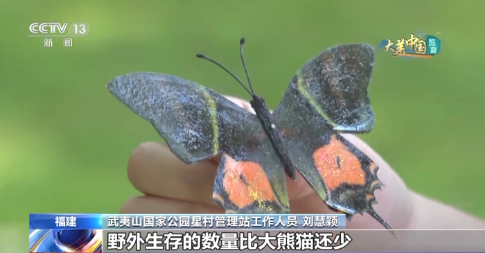 武夷山国家公园星村管理站工作人员 刘慧颖:它非常罕见,野外生存的数量比大熊猫还少,是我国唯一被列入国家一级保护动物的蝶类,也是中国特有蝴蝶。除了金斑喙凤蝶,国家公园还记录过7种昆虫国家重点保护野生动物,像金裳凤蝶、拉步甲等。