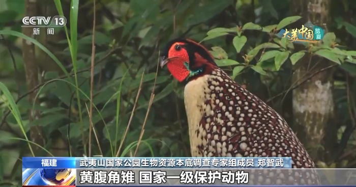 武夷山国家公园生物资源本底调查专家组成员 郑智武:黄腹角雉,国家一级保护动物,在民间被叫作大笨鸡,因为它体型比较大,比较笨重,平时只善于行走,不善于飞行。封山保护以后,现在全世界4000多只黄腹角雉中,福建就有1000多只。