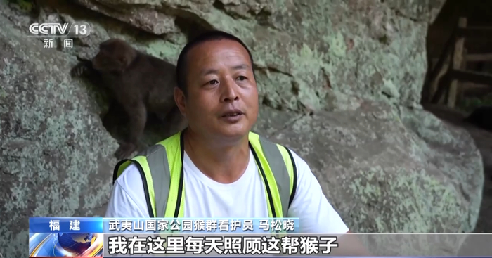 武夷山国家公园猴群看护员 马松晓:游客不知道猴子吃什么,什么不吃,有些垃圾食品也投喂给猴子,造成猴子不健康。我照顾这帮猴子已经六年了,每天都要和它们这样互动,我陪它们的时间比陪我孩子的时间还要多。