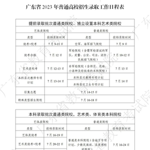 广东省2023年高考志愿填报工作已经顺利结束,招生录取工作将于7月9日至8月13日进行。其中,提前批为7月9日至18日,本科批为7月16日至31日,专科批为8月1日至8月13日。工作日程后续如有调整,请以省教育考试院官微官网的最新通知为准。录取结果一般在该批次录取完成后的次日可查。