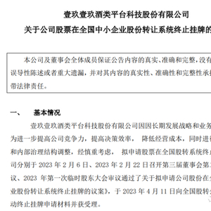 近日,壹玖壹玖发布公告称,公司于2023年4月11日向全国股转公司提交主动终止挂牌申请材料并获受理。根据《全国中小企业股份转让系统挂牌公司股票终止挂牌实施细则》的规定,全国股转公司同意公司股票自2023年6月30日起终止在全国中小企业股份转让系统挂牌。