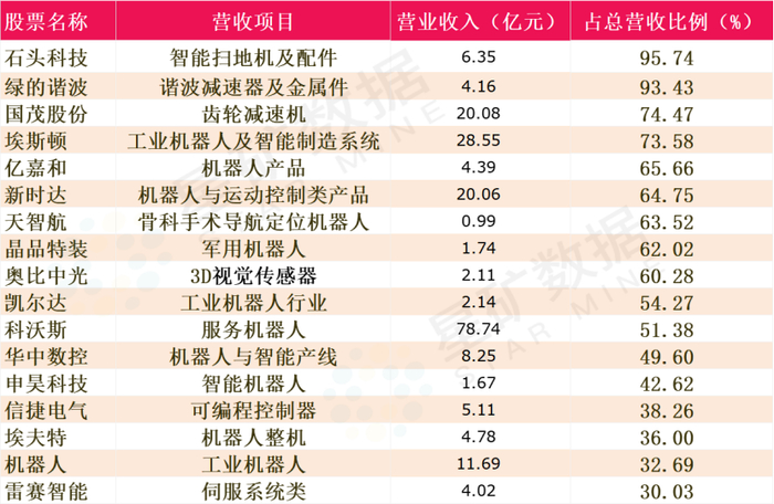另据星矿数据梳理,其中,机器人业务占营收比例排名前三的A股上市公司分别为石头科技、绿地谐波和国茂股份,具体比例分别高达95.74%、93.43%和74.47%。另外,机器人业务占营收比例超50%的上市公司还有埃斯顿、亿嘉和、新时达、天智航、晶品特装、奥比中光、凯尔达和科沃斯,具体详见下表: