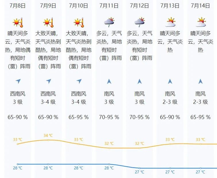 预计8-10日晴天间多云,天气炎热到酷热,最高气温33-35℃,局地偶有短时(雷)阵雨;11-12日多云炎热,局地有短时(雷)阵雨。展望13-16日,炎热天气持续。