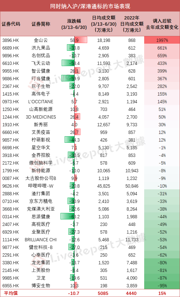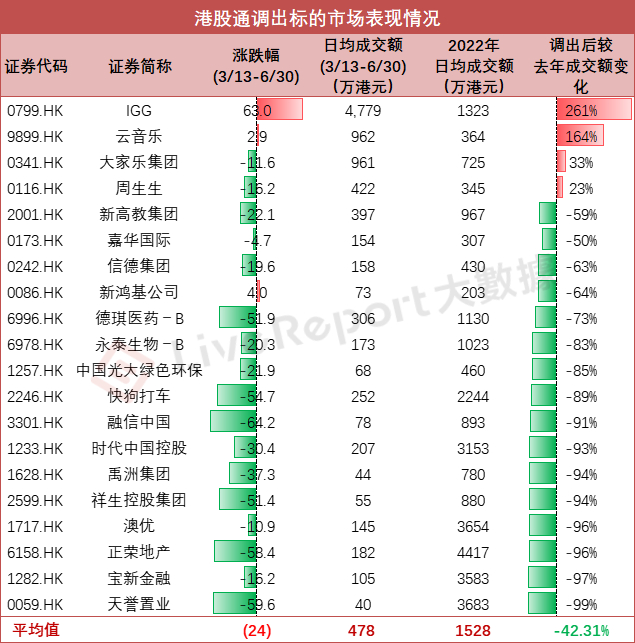 1)截至6月30日,获新纳入的港股通标的平均股价下跌11%,成交量提升15%;被剔除的港股通标的平均股价下跌24%,成交量萎缩42%。
