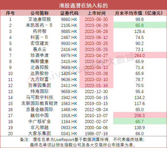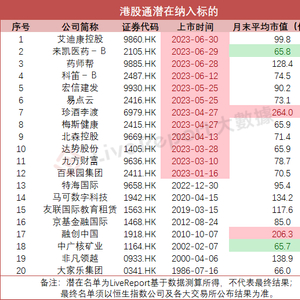 据LiveReport大数据,预计有20只股票可能获新纳入港股通,24只现有港股通标的可能遭剔除。
