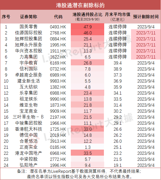 现有港股通标的中预计遭调出的24只股票分别为:宇华教育、信利国际、卓越商企服务、建业新生活、互太纺织、乐享集团、祖龙娱乐、维亚生物、宝龙商业、三叶草生物-B、中骏集团控股、香港航天科技、德信中国、合景悠活、正商实业、港龙中国地产、中梁控股弘阳地产,以及长期停牌的国美零售、佳源国际控股、旭辉控股集团、旭辉永升服务、华兴资本控股、力高集团。