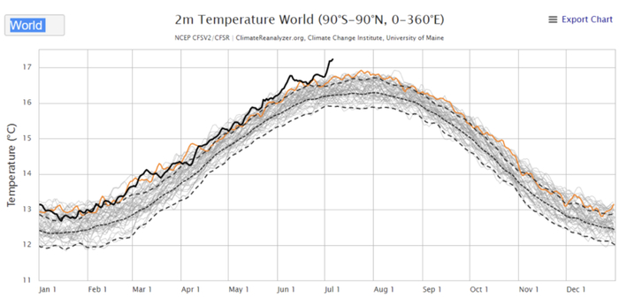 在短短四天内,全球平均气温已经三次创下新高,分别为7月3日的17.01摄氏度、7月4日的17.18摄氏度、7月6日的17.23摄氏度。