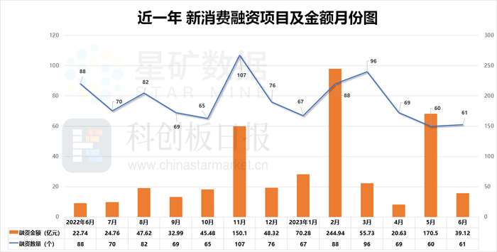 财联社创投通数据,2023年6月国内消费领域总计有61起融资,同比2022年6月下降30.68%,环比5月并未有明显变化。