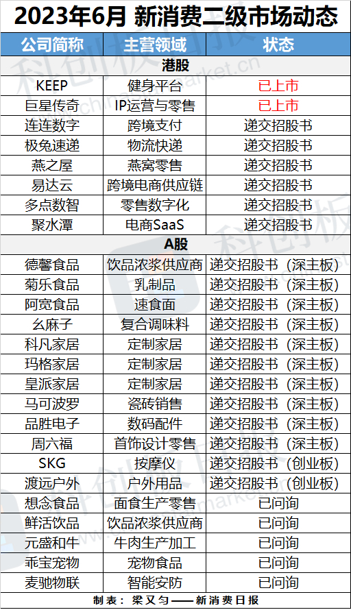 6月二级市场一改此前数月的冷清,A股不少消费公司积极更新业绩数据,并恢复监管问询。此外,KEEP和巨星传奇终于结束数年的上市长跑,即将登陆港股。