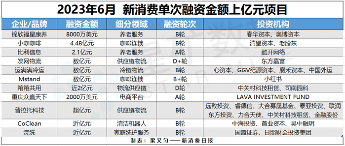 本月机构投资存在明显的关注主线,其中咖啡茶饮和物流供应链最为热闹,上亿元的头部项目大都扎堆于此。