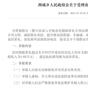 黎川县西城乡人民政府关于受理农村高价彩礼线索的通告 图据西城乡人民政府
