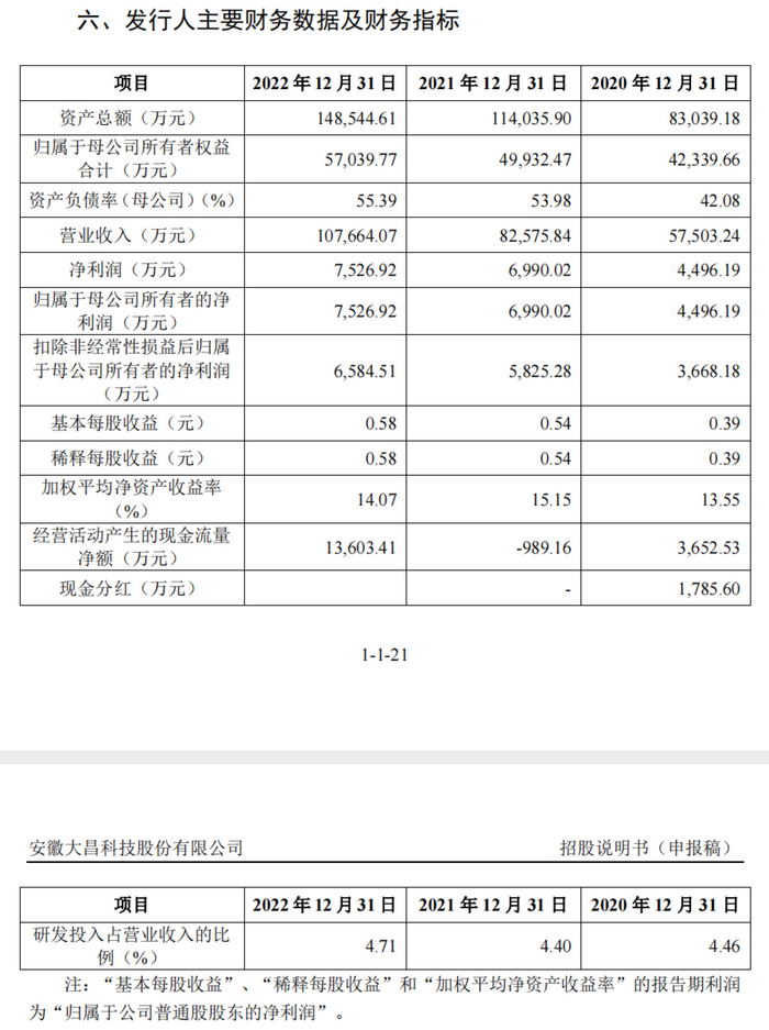 大昌科技拟公开发行不超过4339万股,公开发行股份数量不低于本次发行后总股本的 25%。本次募集资金扣除发行费用后的净额将全部投资于合肥汽车零部件智能工厂项目、汽车零部件智能化生产线技术改造项目等,拟投入募集资金金额3.74亿元。