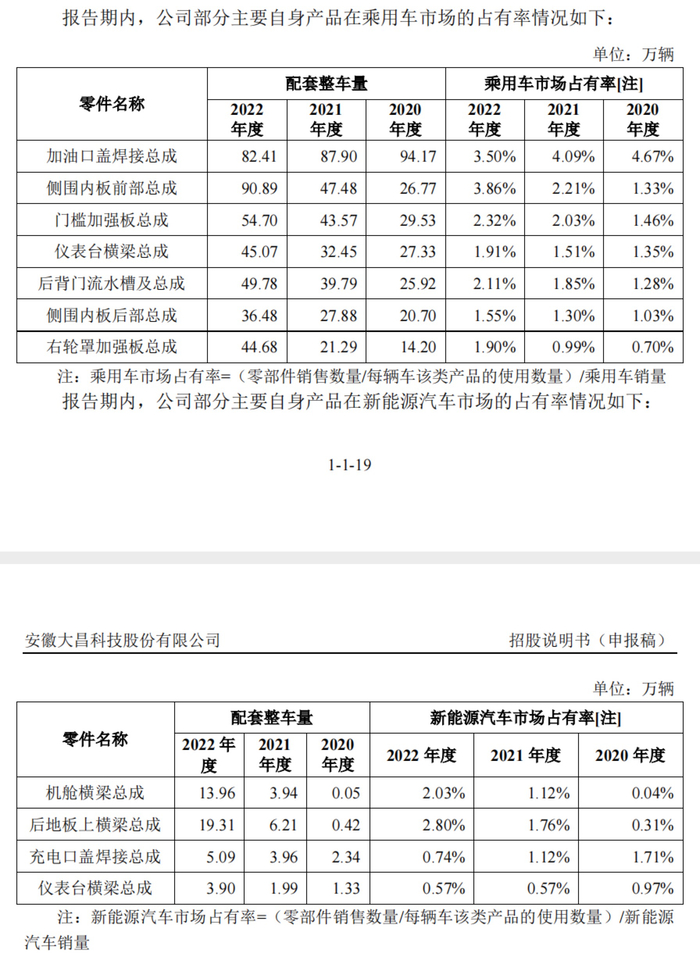 招股书显示,大昌科技主要产品的市场占有率都不足5%,加油口盖焊接总成等主要产品甚至在过去三年经历久了市占率逐年下滑;主要产品在新能源汽车的市占率甚至不足3%。