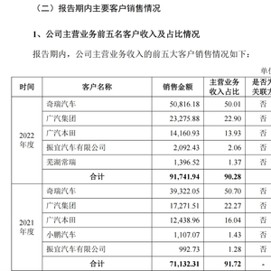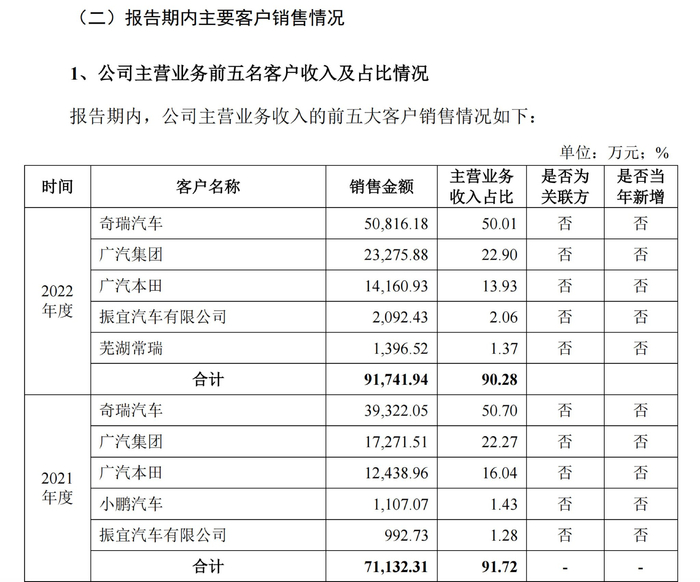 2020年度、2021年度和2022年度,大昌科技主营业务前五大客户的收入分别为5.06亿元、7.11亿元和9.17亿元,占主营业务收入的比例分别为91.85%、91.72%和90.28%,客户集中度较高,主要包括奇瑞汽车、广汽集团、广汽本田等。其中,过去三年大昌科技来自奇瑞汽车主营业务收入分别为2.39亿元、3.93亿元和 5.08亿元,占主营业务收入的比例分别为43.35%、50.70%和50.01%,大昌科技强调:“公司对奇瑞汽车存在重大依赖。”