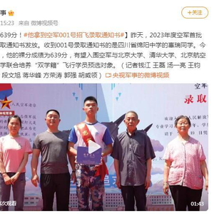 昨天,2023年度空军首批招飞录取通知书发放。收到001号录取通知书的是四川省绵阳中学的辜瑞同学。今年高考,他的裸分成绩为639分,有望入围空军与北京大学、清华大学、北京航空航天大学联合培养“双学籍”飞行学员预选对象。(记者钱江 王磊 汤一亮 王钧 班金庭 段文旭 蒋华峰 方荣涛 郭强 胡威领)