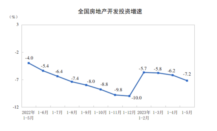 在房屋新开工面积下降、竣工面积增加的双重影响,目前房屋在建规模减少,1-5月,房屋施工面积同比下降6.2%,降幅较前4个月有所扩大。整体来看,1-5月,房地产开发投资同比下降7.2%,降幅比1-4月再扩大1个百分点。