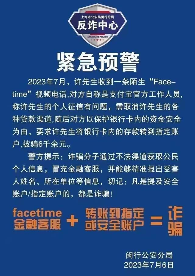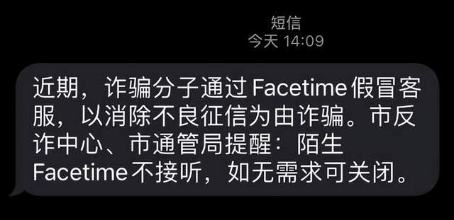 诈骗分子发送FaceTime邀请冒充金融平台客服,声称受害人金融账户有问题,如不及时处理将影响其征信,给受害者制造心理恐慌。