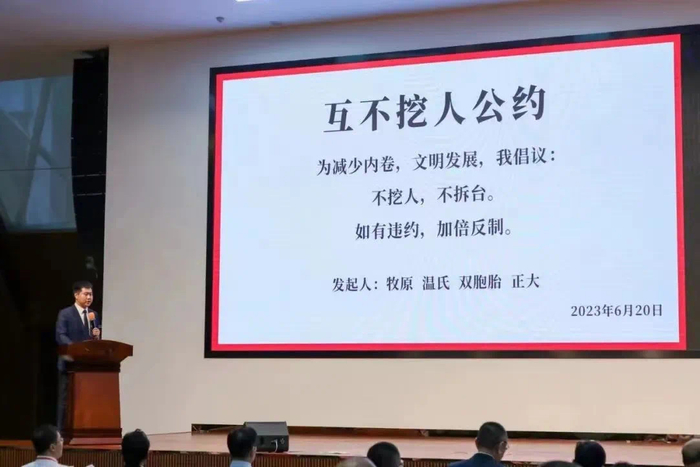 6月20日,在牧原集团举办的第十八届养猪节共创共享论坛上,牧原集团联合温氏、双胞胎、正大向四大养猪企业向行业发出倡议,尊重行业秩序,打造商业文明,并签署“互不挖人公约”。公约具体内容为:为减少内卷,文明发展,我倡议:不挖人,不拆台。如有违约,加倍反制。