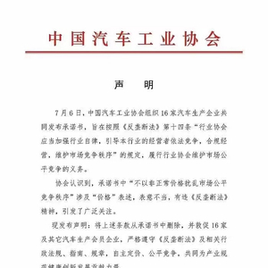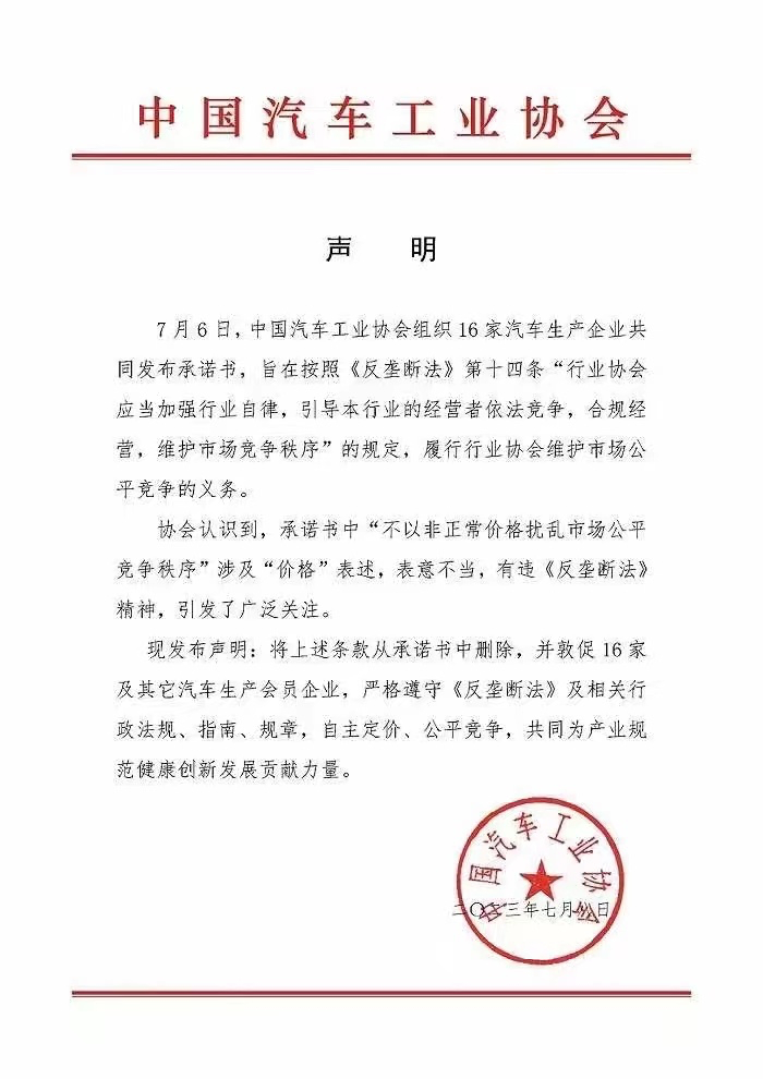 7月8日,中国汽车工业协会发布声明表示,7月6日组织16家汽车生产企业共同发布的《承诺书》中,“不以非正常价格扰乱市场公平竞争秩序”涉及“价格〞表述,表意不当,有违“反垄断法”精神。声明表示,将上述条款从《承诺书》中删除。