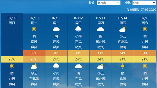 北京明天最高气温还将达39℃,但11日就将退出“高温群”降至34℃,12日最高温继续下降至30℃。