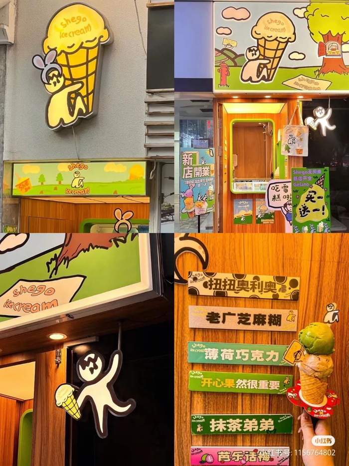 网红“粑粑雪糕”Shego Icecream(shego是粤语雪糕的谐音),主打手工gelato和新鲜时令水果制成的雪葩。品牌走可爱搞怪的卡通风,logo是一个蹲着“拉屎”的小人,延伸成各式有趣搞怪的风格插画,散落在店内、并制作成宣传物料/免费周边。色彩缤纷、滑稽又可爱门店十分抢镜,引发排队热潮。