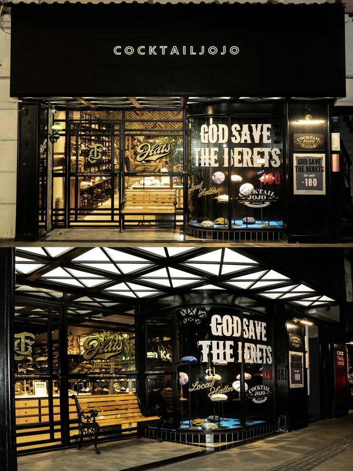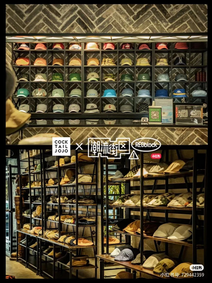 “帽子爱好者的天堂”COCKTAIL JOJO,主打各种帽类和配饰。门店采用哑黑、青砖灰、胡桃木及玫瑰金的色调,走美式复古风,吸引余文乐等明星到店打卡。