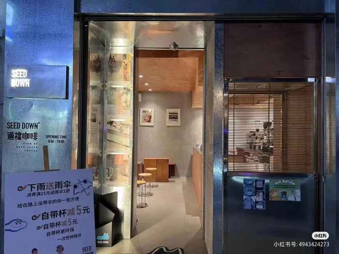 SEED DOWN围绕“做个舒适的、有人情味的、提供归属感的小档口”为理念,营造社区交往空间。如饲养流浪猫并以流浪猫为主题logo;下雨天主动给购买咖啡的客人送伞;店内通过红砖墙面、原木打造简约工业风,简笔涂鸦散落各处;设置外摆区域及周边售卖区“适档百货”(售卖衣服、帽子、雨伞、咖啡豆、咖啡杯等),惬意的老广情调满满。