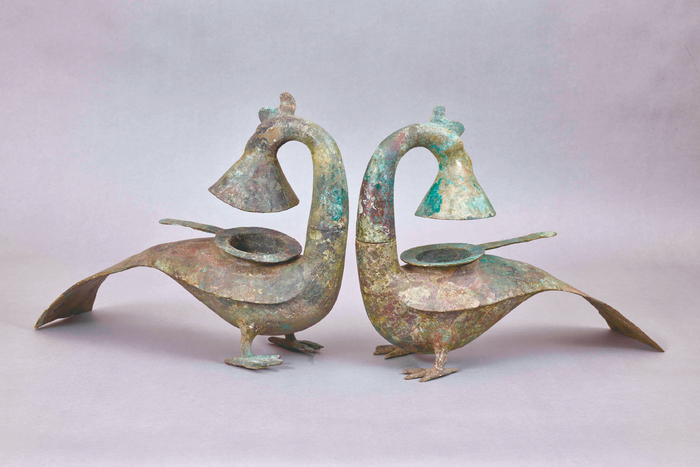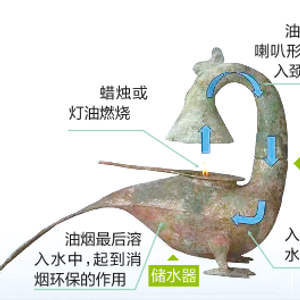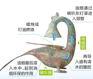 羽纹铜凤灯的造型像两只顾首回望的凤凰,通体细刻羽毛,精致美观。凤鸟背部有一个用来放置灯盏的圆孔。最为神奇的是,当蜡烛或灯油燃烧时,油烟通过凤鸟嘴中衔着的喇叭形灯罩进入颈管,再导入盛有清水的腹腔,最后溶入水中,具有消烟环保的功能。