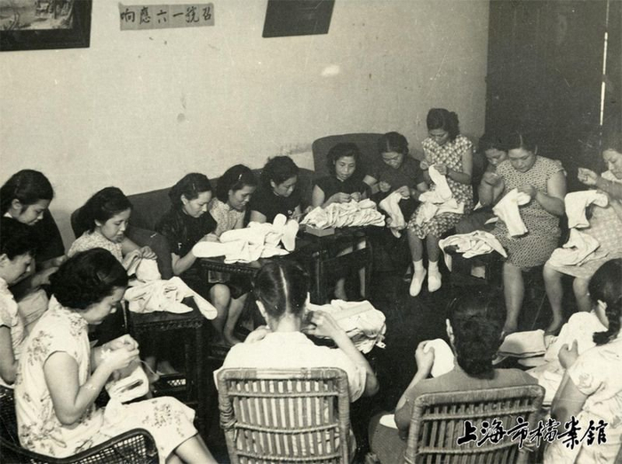 1951年,上海妇女赶制送往朝鲜前线的军袜
