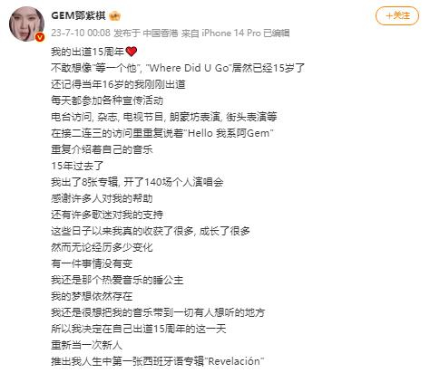 邓紫棋晒照庆祝出道15周年 将惊喜发行首张西班牙语专辑