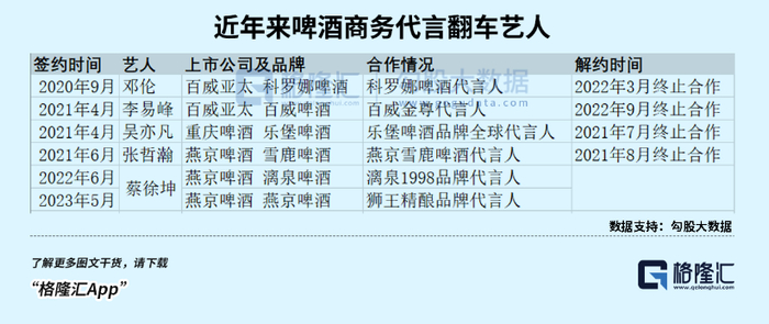 百威亚太曾分别签约邓伦和李易峰代言过科罗娜和百威金尊,乐堡曾经的代言人则是吴亦凡,随着这些流量明星的各类丑闻爆出,合约也随之中止。