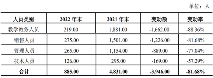 与此同时,据《关于2021年度审计报告与持续经营重大不确定性段落无保留意见涉及事项影响已消除的专项说明》显示,开元教育2022年末开元教育在职员工的数量合计885人,较2021年末减少3946人。