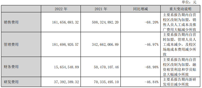 至2023年一季度,开元教育的各项费用仍在大幅度收缩。因校区转加盟,开元教育一季度其营业成本同比减少51.51%;销售费用同比减少80.27%,主要由于报告期内恒企教育及天琥教育校企自营转加盟后,销售人员人工成本及推广费用大幅减少;管理费用减少32.24%,主要由于上述校区自营转加盟后,管理人员人工成本减少且校区场地成本费用减少;研发费用同比减少52.24%,为期内新研发项目减少;财务费用同比减少89.03%;主要也是由于上述校区自营转加盟后,融资租赁利息及学员贴息大幅减少。