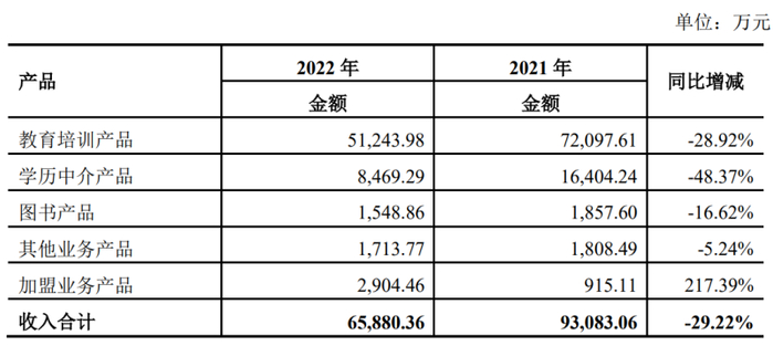 但据年报显示,2022年度,开元教育的教育培训产品仍贡献了最大规模的营收,全年业务收入达5.12亿元,占总营收的71.08%。对比2021年度,开元教育这一最重要的主营业务的年收入同比减少了近三成,占总收入的比重也同比下降了6个百分点。