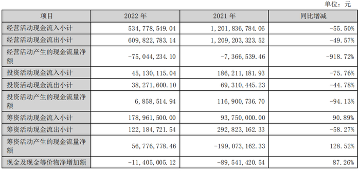 除了扑朔迷离的营收情况,改制也对开元教育的现金流带来了影响,2022年,开元股份经营活动产生的现金流量净流出额为7504.42万元,较上年同期的736.65万元扩大了918.72%。