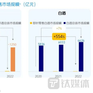 2020年-2022年间,啤酒类即时零售市场规模增长83%,总体市场仅增加了6%;洋酒类即时零售市场增长628%,总体市场规模仅增加了9%;白酒即时零售市场增长554%,其总体市场规模仅增加了7%。