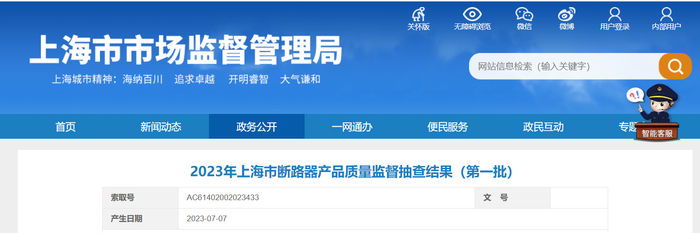 中国质量新闻网讯 2023年7月7日,上海市市场监督管理局网站公布2023年上海市断路器产品质量监督抽查结果(第一批)。