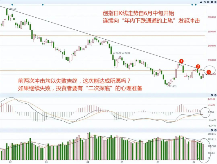 2、随着年内下跌通道的上轨不断下移,创指马上又将面临“能否冲破年内下跌通道”的挑战。