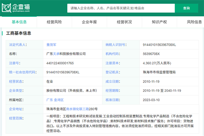 广东天承科技股份有限公司成立于2010年11月19日,地址位于珠海市金湾区南水镇化联三路280号,法定代表人童茂军,经营范围为一般项目:工程和技术研究和试验发展;工业自动控制系统装置制造;专用化学产品制造(不含危险化学品);专用化学产品销售(不含危险化学品);新材料技术研发;新材料技术推广服务;许可项目:货物进出口。以上不涉及外商投资准入特别管理措施内容,依法须经批准的项目,经相关部门批准后方可开展经营活动。