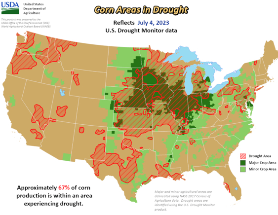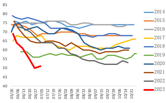 在从拉尼娜向厄尔尼诺转变的过程中,美玉米正值种植与生长期,美玉米产区遭遇了前所未有的干燥天气。3月NOAA宣布持续三年的拉尼娜正式消退,不过气象模型显示赤道太平洋海面温度正逐步向厄尔尼诺方向发展;四月玉米产区天气适宜,美玉米播种偏早,且在较为干燥的天气下玉米播种速度整体偏快;进入五月玉米产区天气持续干燥,玉米种植快速推进至完成,且部分产区存在降雨,玉米整体发育良好;不过进入六月,干旱席卷整个玉米带区域,玉米产区干旱面积比例持续上升,从最初5月中旬保持在30%以下逐步提升至6月末的70%,且伴随着土地墒情的恶化,美玉米优良率持续大幅回落,从5月末初次公布的69%快速跌至6月末的50%,整体跌幅与速度均远超往年。