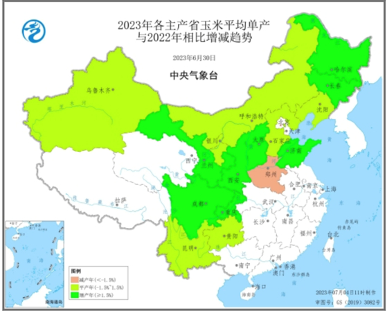 中国玉米主产区为东北地区与华北地区,东北地区主要种植春玉米,播种期在4-5月;华北地区主要种植夏玉米,播种期在6月。今年玉米播种以来,东北地区自4月下旬至5月上旬出现阶段性低温,不过之后天气转好,土壤墒情合适,东北玉米出苗及生长均利好;但6月以来,初期厄尔尼诺给东北地区带来持续高温少雨,部分地区出现轻度至中度干旱,使得玉米长势偏弱;不过华北地区整体降水偏多,夏玉米种植及出苗顺利,但之后也受到高温侵扰,甚至部分地区出现高温烧种灼苗现象,从而对生长不利。中央气象台根据玉米播种以来的气象条件建立模型预测,2023年玉米单产环比持平,主产区中黑龙江、吉林和山东单产或有提升,河南单产略微下降。整体来看,在厄尔尼诺形成初期,中国北方干旱问题已经初步显现,后续玉米生长及成熟仍需关注降雨及温度变化情况。