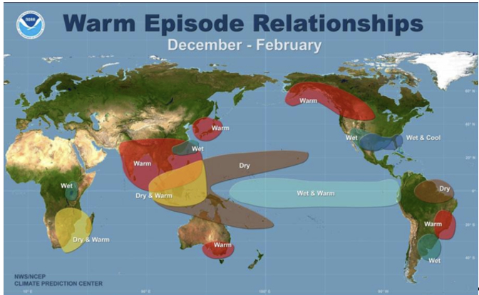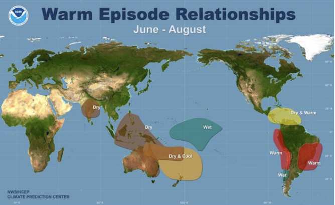 厄尔尼诺对全球大部分区域的气候均有影响,不过其影响区域因出现时间不同而存在差异。一般而言,北半球夏季厄尔尼诺(6-8月)的影响区域较少,主要会使南亚、东南亚及澳大利亚北部出现干旱,巴西中部和南部、智利中部和北部更加温暖;北半球冬季厄尔尼诺(12-2月)影响范围更大,其中东南亚和巴西东北亚会出现干旱;南亚、东北亚、加拿大西南部及美国西北部、澳大利亚东南部和巴西南部更加温暖;中国东南部和美国南部则会更加湿润。