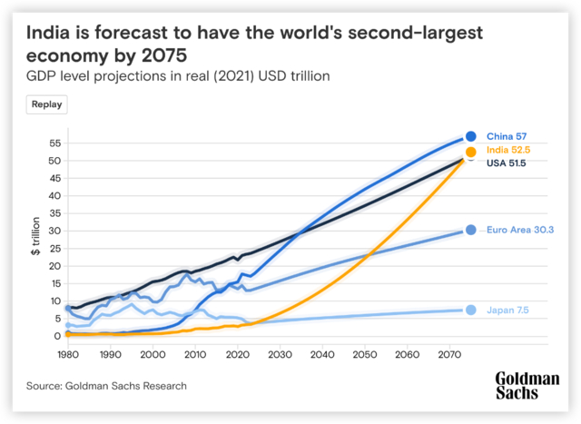 高盛预测:到 2075 年,印度将超越美国成为第二大经济体