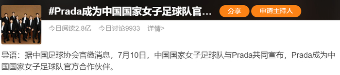 7月10日,中国国家女子足球队与Prada共同宣布,Prada成为中国国家女子足球队官方合作伙伴。