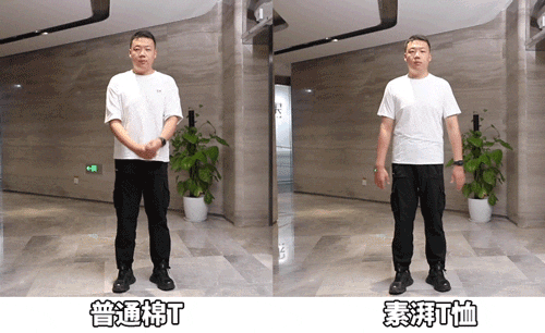 品牌做热传递测验:将手放在素湃T恤和普通棉T下面,等待身体的热量透过,普通棉T要经过7秒才能将温度升高至32度。