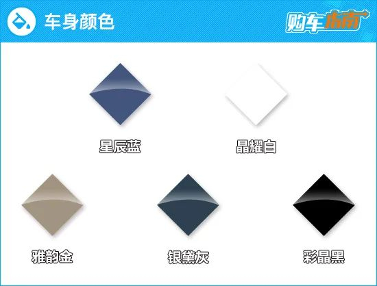 在颜色方面,新车提供了五种颜色可选,它们分别为星辰蓝、晶耀白、雅韵金、银黛灰、彩晶黑。其中星辰蓝为主打色,消费者可优先考虑。另外,根据官网显示,晶耀白需另付色漆定制费用。